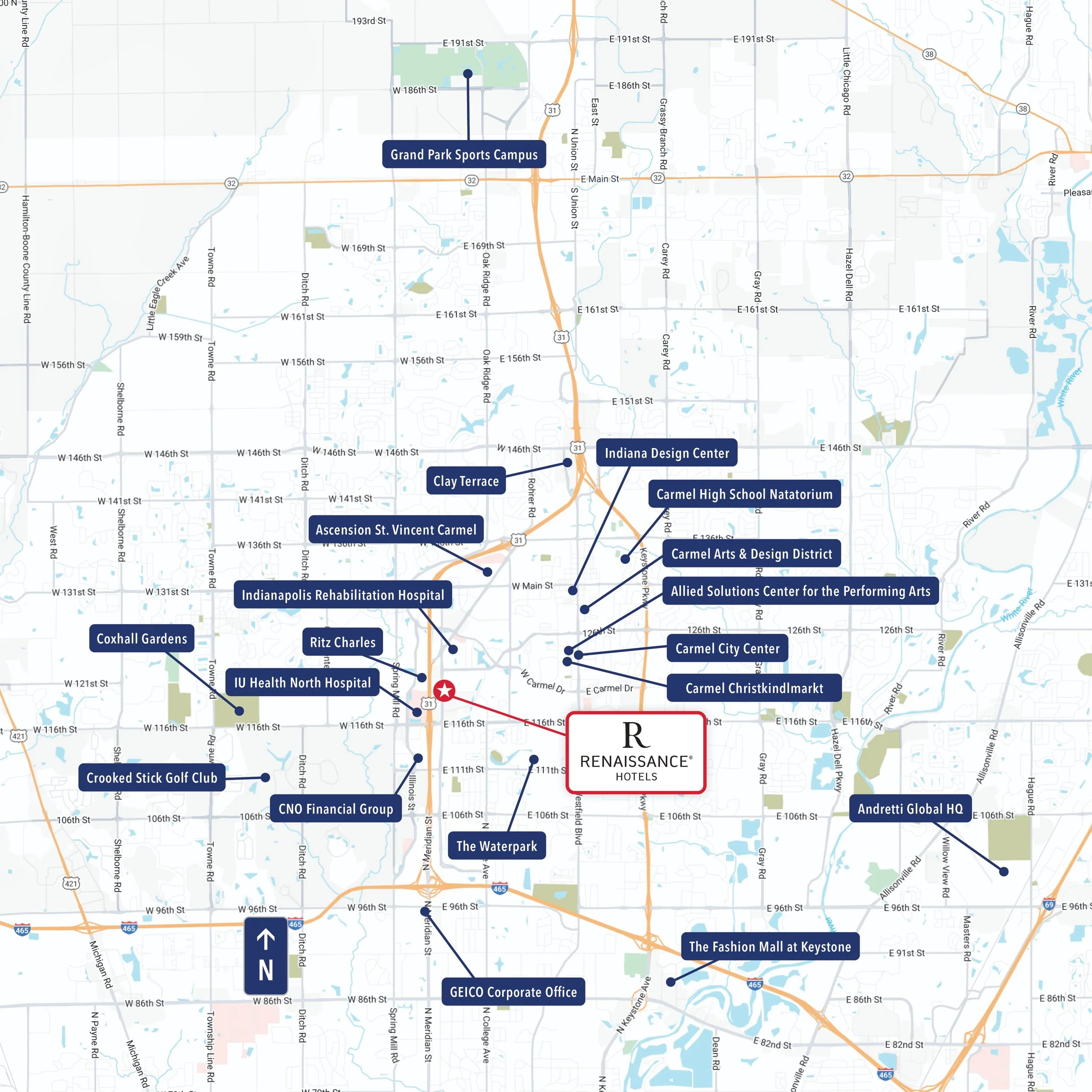 Institutionally owned and in outstanding physical condition, the Renaissance is North Indianapolis’ premier full-service hotel. The eight-story property offers 266 guest rooms, 14,844 square feet of first-class meeting and event space, an on-site restaurant and bar, Starbucks café, club lounge, and indoor pool. The Renaissance enjoys exceptional visibility along U.S. 31 in North Indianapolis’ Meridian Corporate Corridor, the region’s premier business hub. Positioned just minutes from I-465 and Carmel’s thriving City Center—and less than 20 minutes from downtown Indianapolis—the Hotel offers outstanding accessibility to top corporate, leisure, medical, and cultural demand drivers.